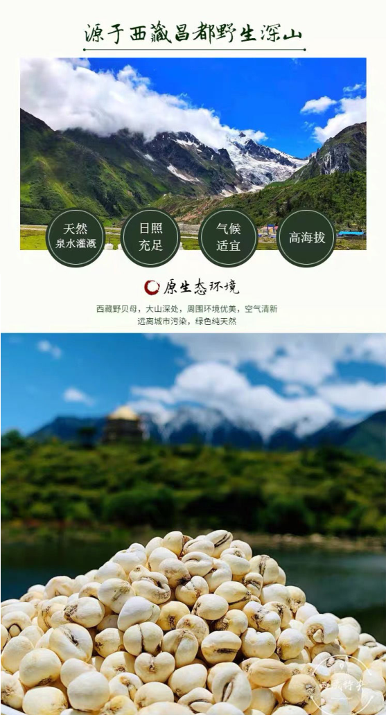 藏貝母藏貝母是西藏這片神奇的土地所孕育的山珍中的一種。藏貝母含豐富的生物鹼,貝母素、甲、乙、丙、丁、川貝鹼,爐貝鹼等有效成分,為貝母中之佳品。屬百合科,生長(zhǎng)于高山草地、礫石灘、灌叢地,其中年生育期為90至105天,它對(duì)生長(zhǎng)條件的要求極其嚴(yán)苛。怎么樣將藏貝和其他的貝母區(qū)別開(kāi)來(lái)..